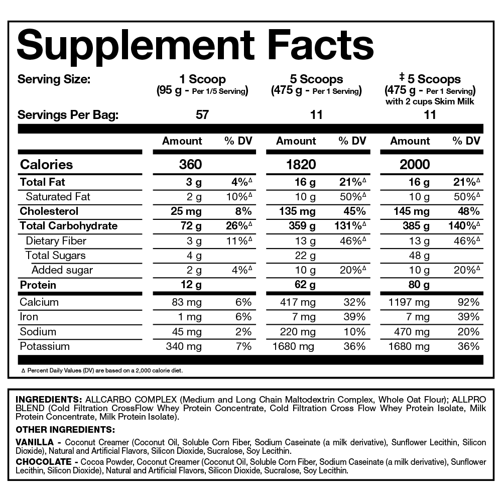 The simple truth is that most athletes do not eat enough to fully recover from hard practice or training. The tedious act of consuming the necessary calories every single day is the hardest part of putting on lean body weight and recovering from intense exercise. AllMass provides up to 2000 calories per serving, basically hacking your post workout routine, and making it an easy area of success for the young athlete hungry for results.